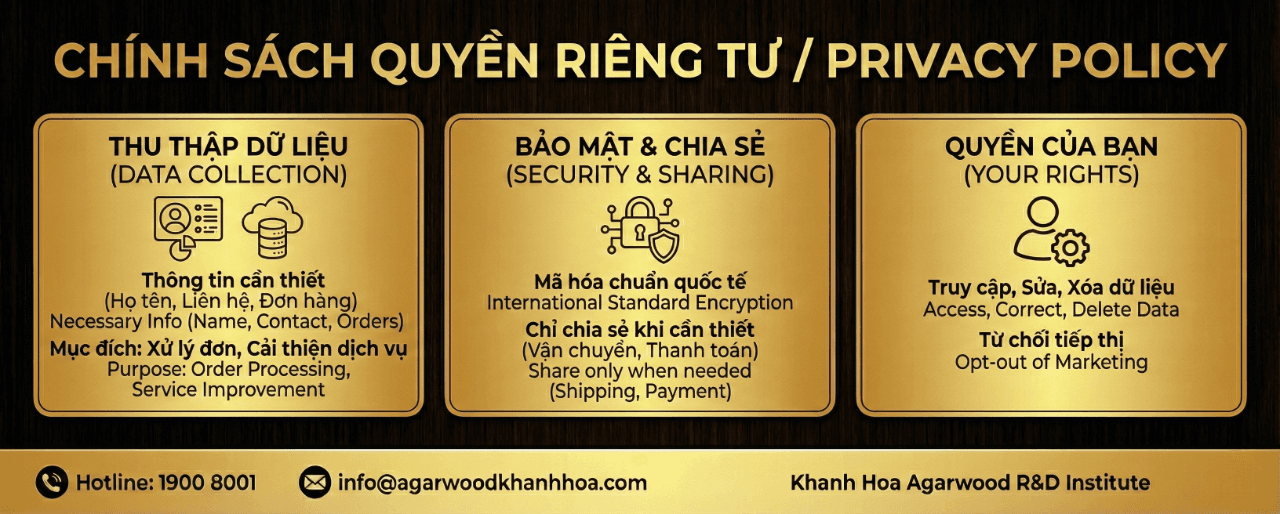 1. Introduction and Scope This Privacy Policy explains how the Khanh Hoa Agarwood Research and Development Institute (hereinafter referred to as “we”, “us”, or “the Institute”) collects, uses, stores, and protects your personal data when you visit or use the website https://agarwoodkhanhhoa.com, make purchases, register an account, subscribe to newsletters, or interact with us in any way.